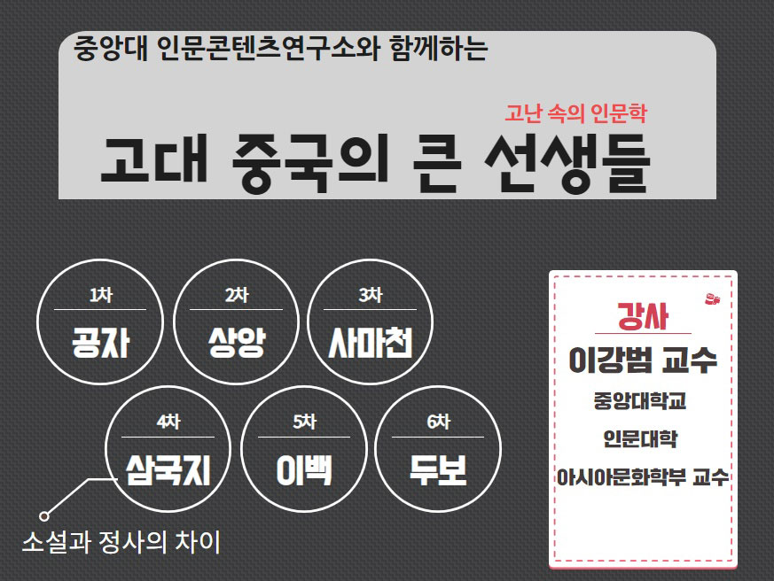 총 6회 진행되는 야간 무료 인문학 강좌로 중국 고전에 나오는 인물 중심으로 그들이 겪었던 고난을 어떻게 극복을 했는지를 함께 나누는 시간입니다.