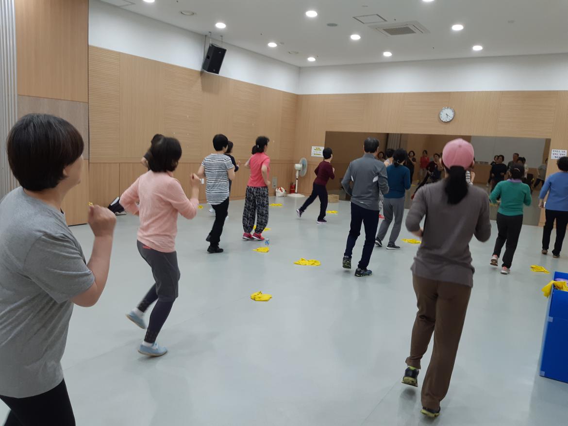 시작 첫날부터 음악에 맞춰 율동을 하는 신중년의 모습이 매우 활기차고 어디서 많이 해본 듯하네요~ smileysmiley