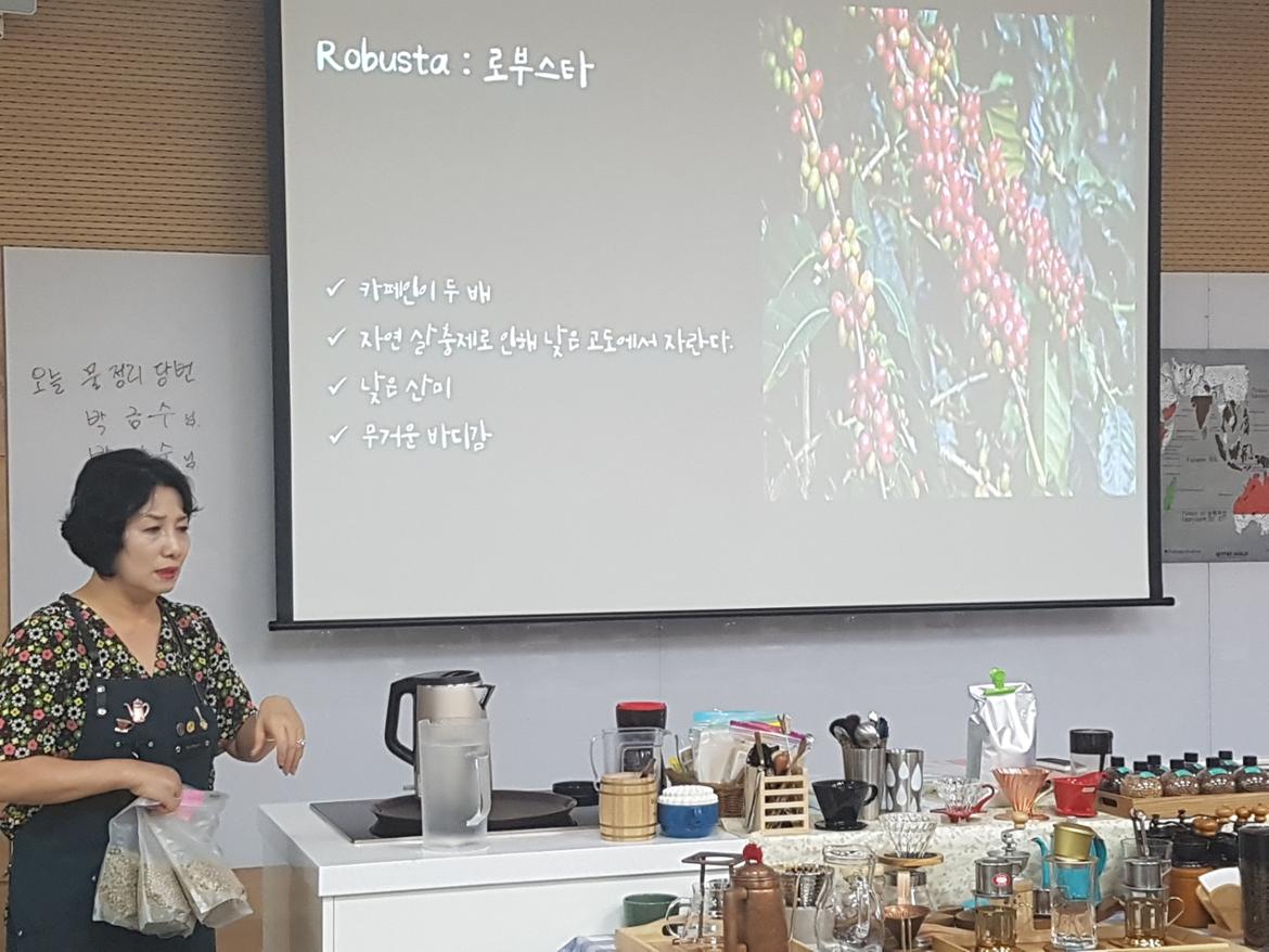베트남 커피의 원두인 '로부스타' 에 대해 소개를 하시는 중인 안 서 진 강사님.