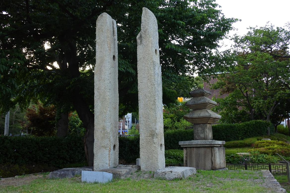 이후 트레킹팀은 중초사지 당간지주와 삼층석탑이 자리잡고 있는 김중업기념관으로 향했습니다. 중초사지 당간지주는 후기 신라 흥덕왕 때인 827년에 건립한 것으로 보물 4호로 지정되어 있습니다. 그 옆으로는 복원한 중초사지 삼층석탑도 서 있답니다. 중초사는 신라시대에 안양 삼성산 아래에 있던 사찰로 규모가 상당했던 대찰이었다고 합니다.