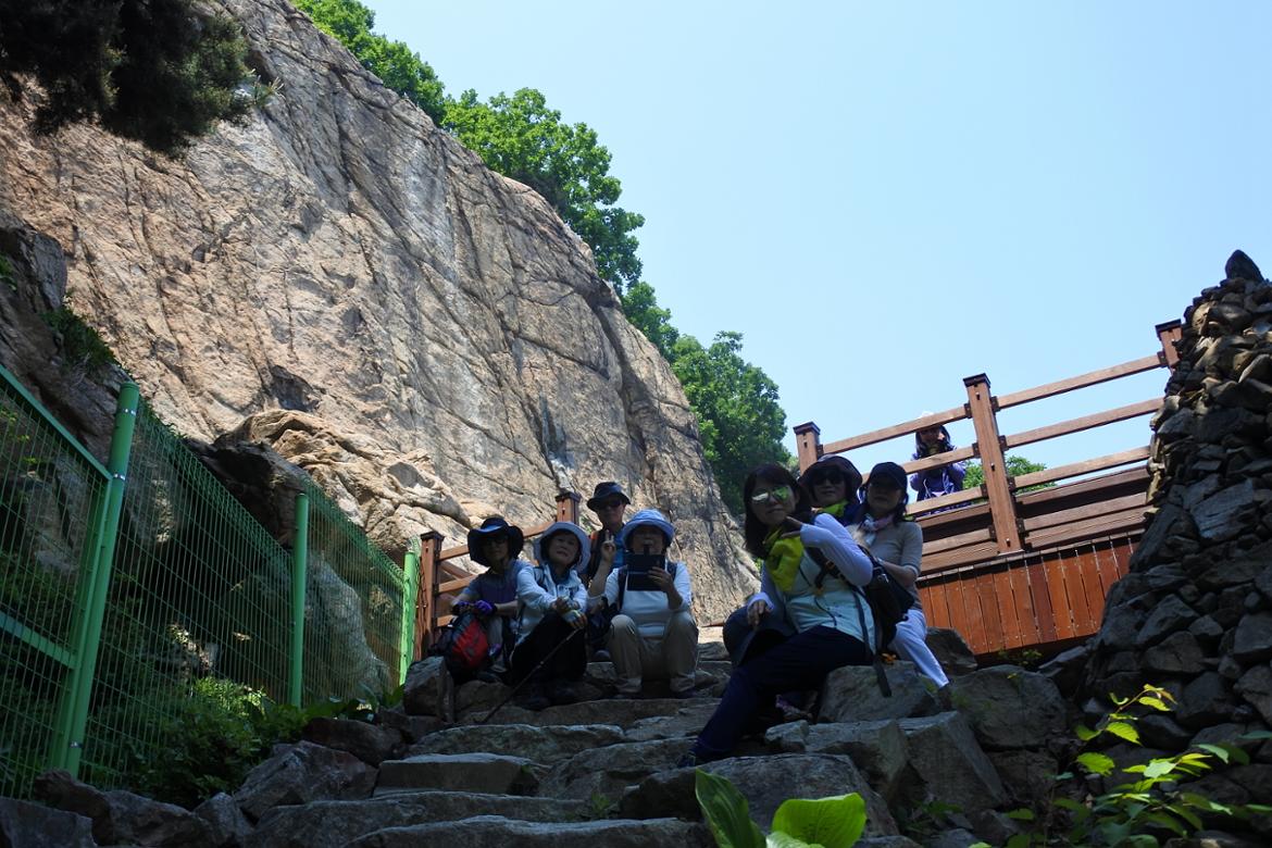 트레킹팀은 소래산 산림욕장에서 식사를 한 후 소래산 마애불을 탐방하러 갔습니다. 고려 초기에 조성된 소래산 마애불은 높이가 무려 13미터가 넘는답니다. 음각으로 새겨진 마애불은 동쪽 방면을 바라보고 있는데 그곳에 서면 멀리 서울의 서쪽 부근이 잘 보입니다. 마애불 앞쪽에 데크 시설을 했는데 그 자체가 전망대 역할을 하는 것이죠.
