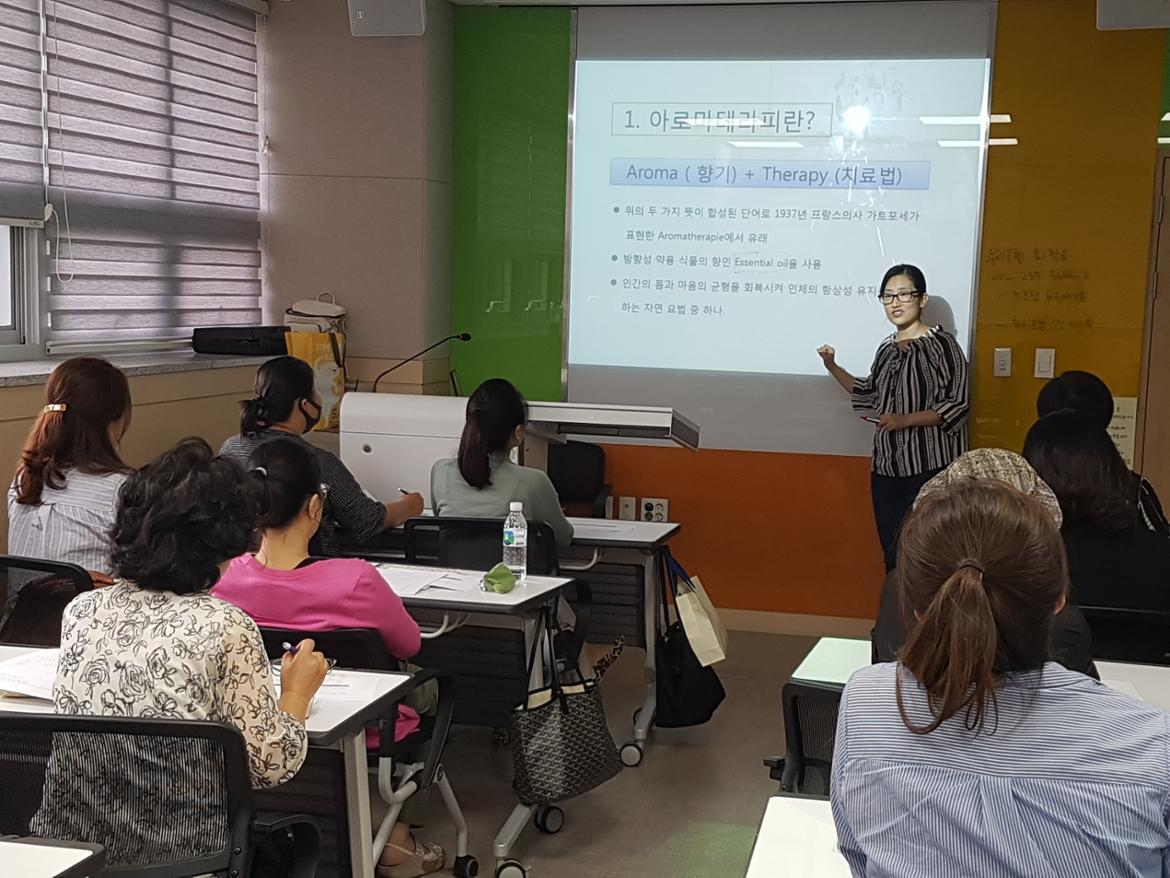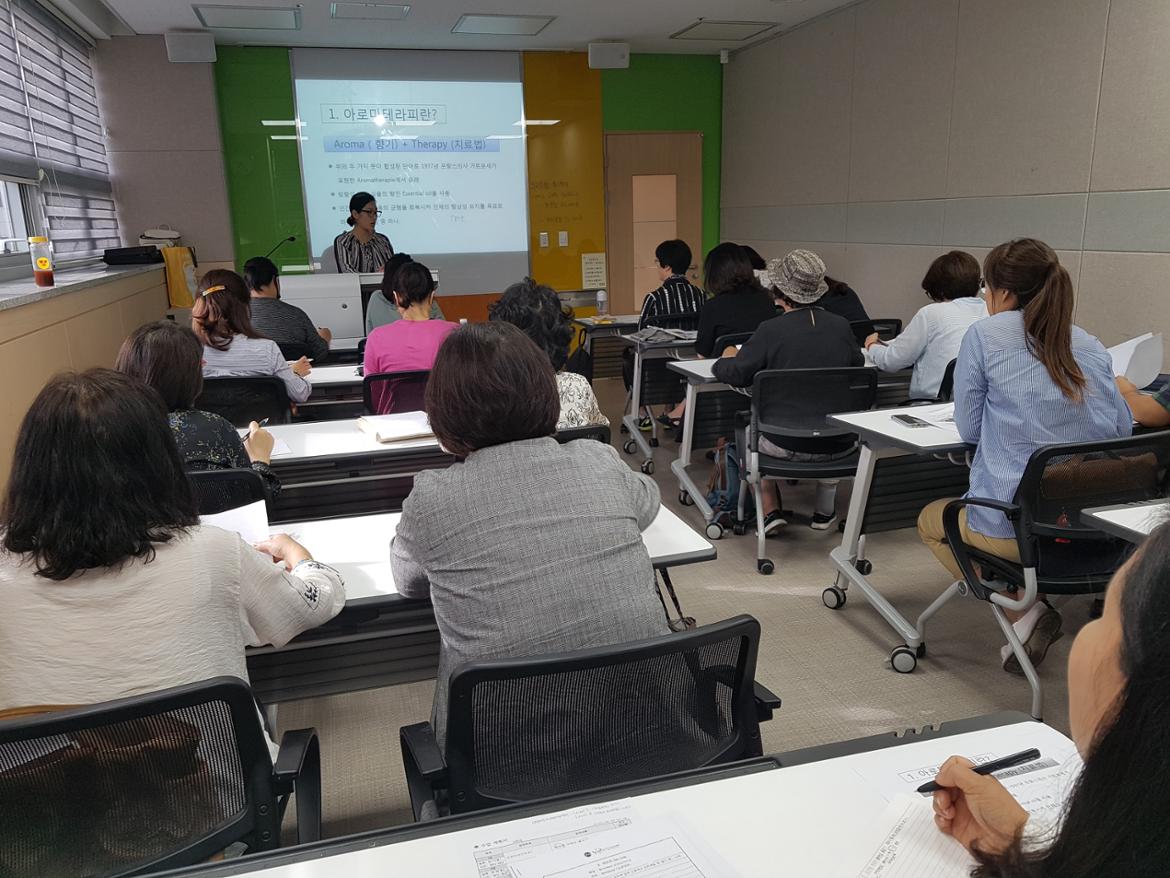 50+의 자격증 선호를 입증이나 하듯이 302호를 꽉 채우고 마침내 아로마 테라피 자격증 과정이 시작되었다.